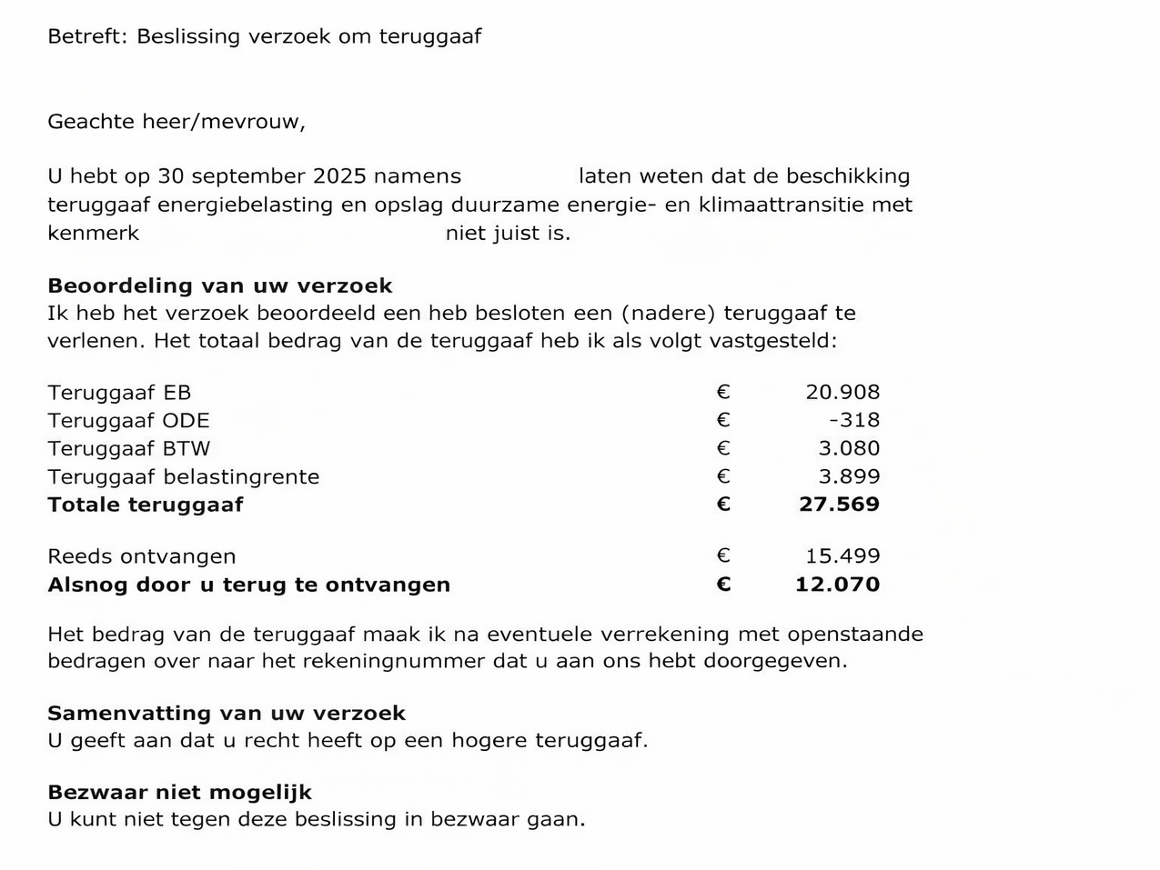 Toch loont het vaak om kritisch mee te kijken. Wanneer wij verwachten dat het beter kan, stellen wij een vrijblijvende second opinion voor. Als uit onze second opinion blijkt dat nog nog niet het maximale resultaat aan teruggave is behaald uit een eerdere aanvraag, kunnen wij dit op no-cure, no-pay basis alsnog voor u verzorgen.